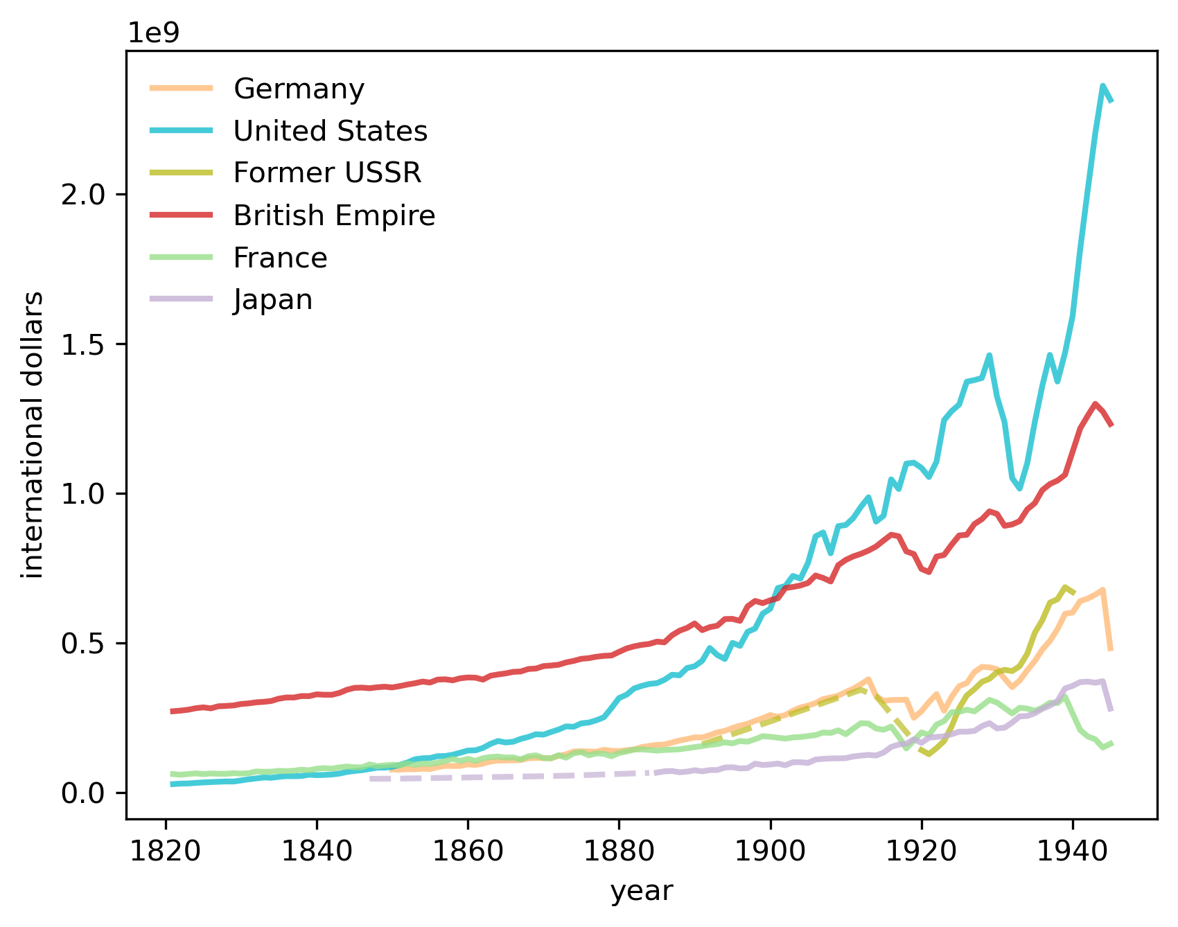 color_mapping, code_to_name, 2, False, ax)It is tempting to compare this graph with figure gdp1 that showed the US overtaking the UK near the start of the “American Century”, a version of the graph featured in chapter 1 of Tooze (2014).